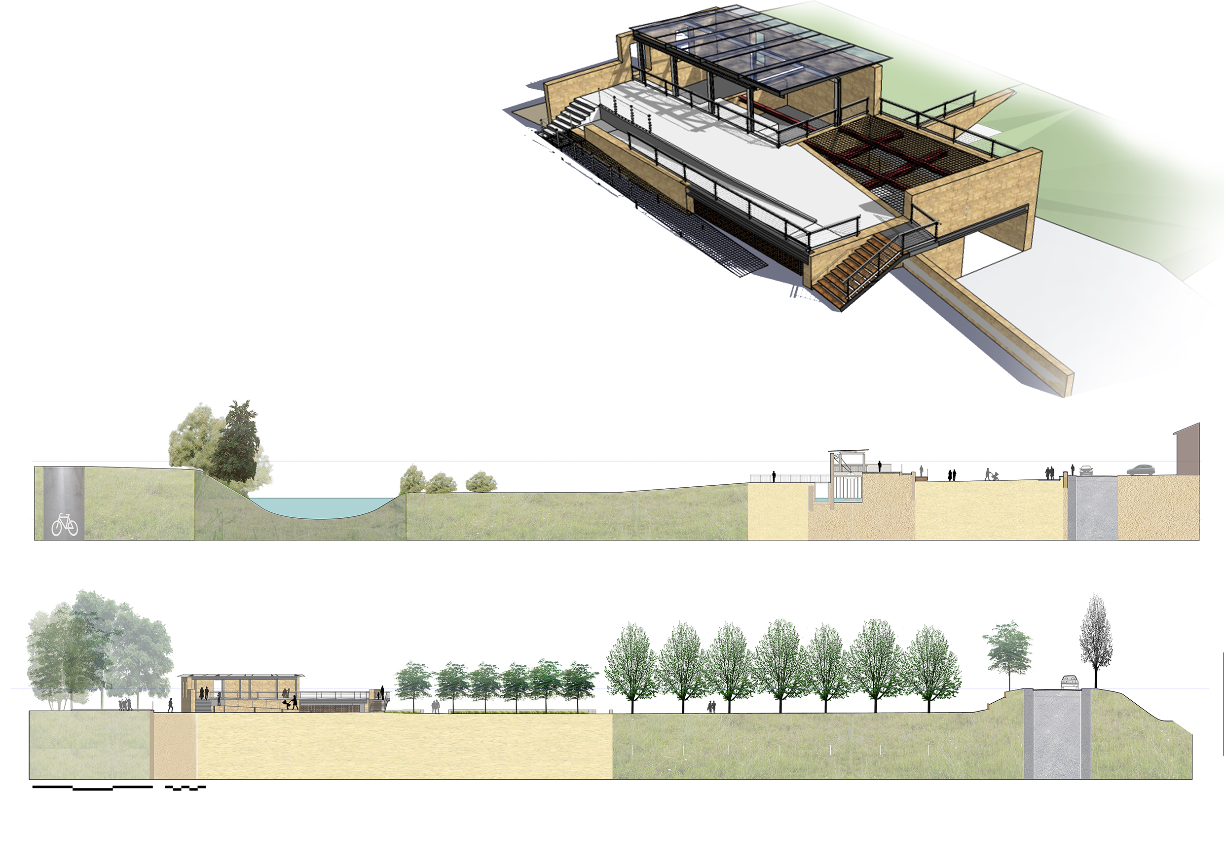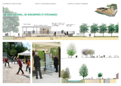 Déconstruction de l’ancienne minoterie et création d’un nouvel espace avec aire d’accueil et de loisirs. Réalisation des coupes paysagères et du schéma 3D