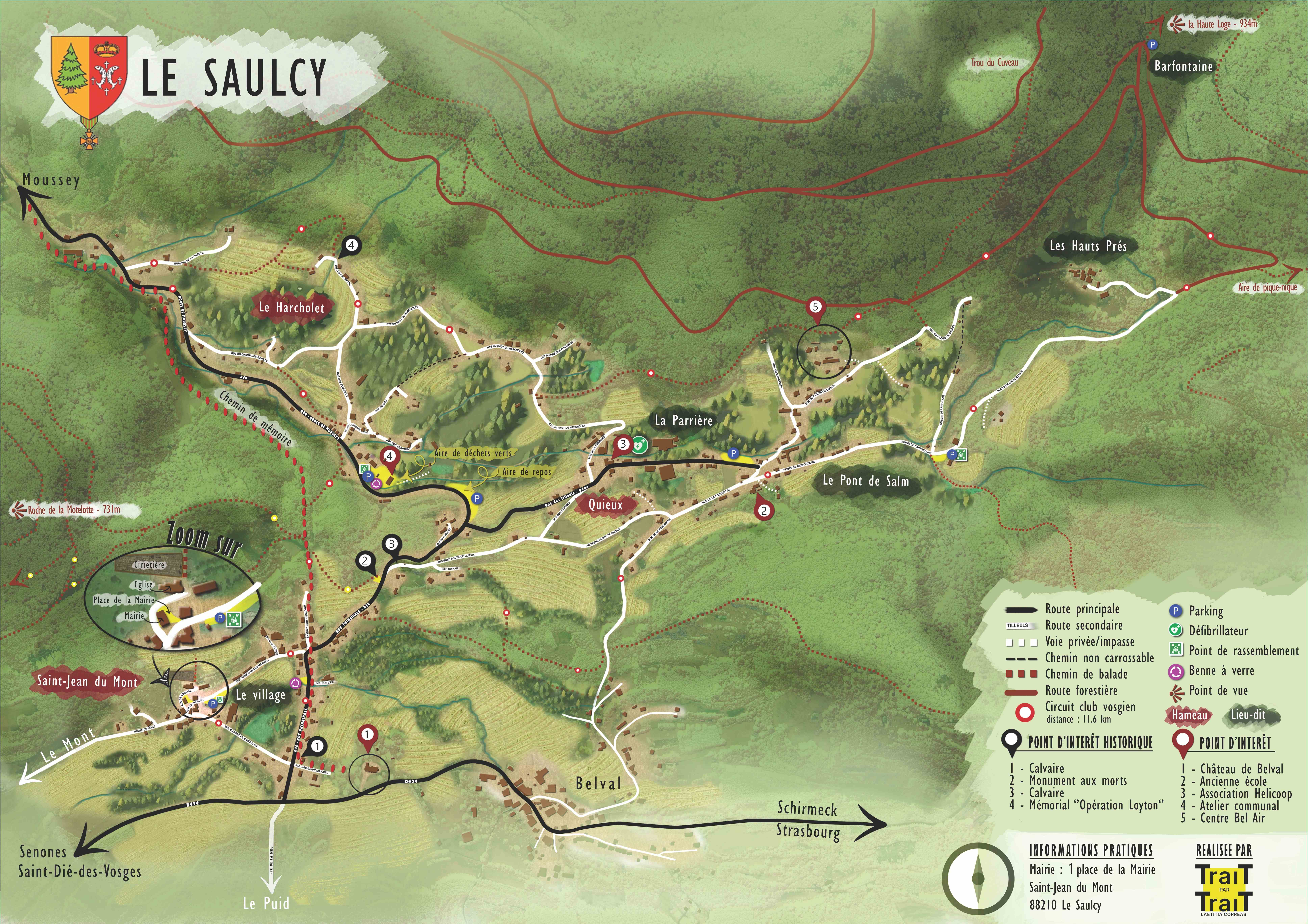 J’ai conçu une carte intégrant différents informations : les points d’intérêt historique (calvaires, monument aux morts), les nouveaux noms de rue, les équipements et éléments techniques essentiels : benne à verre, défibrillateurs, parking, point de rassemblement, les bâtiments communaux : la mairie, l’église, le cimetière. Sur cette carte apparaissent également les différents départs des sentiers de randonnées.